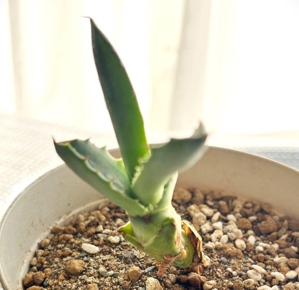 - 特徴:この段階では、アガベの葉は比較的小さく、柔らかいですが、鋭いトゲはすでに形成されています。成長はゆっくりですが、順調に葉の数が増えていきます。
